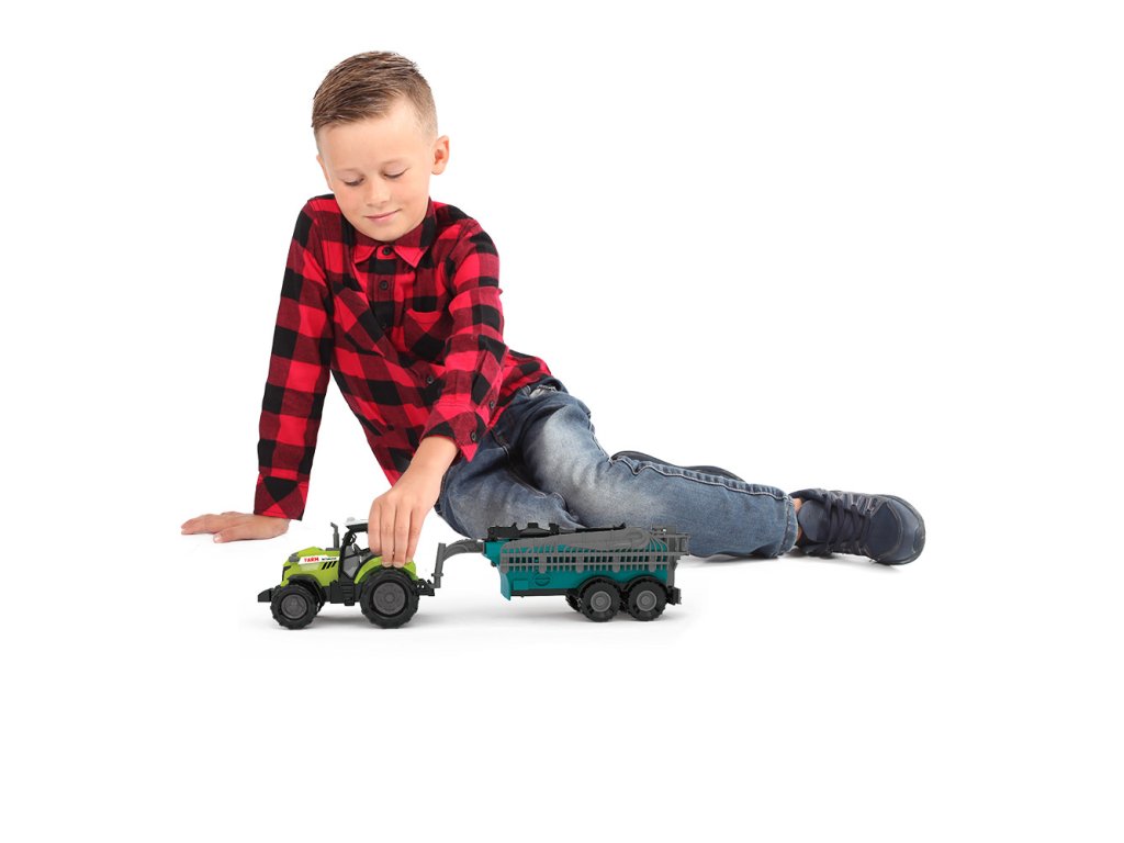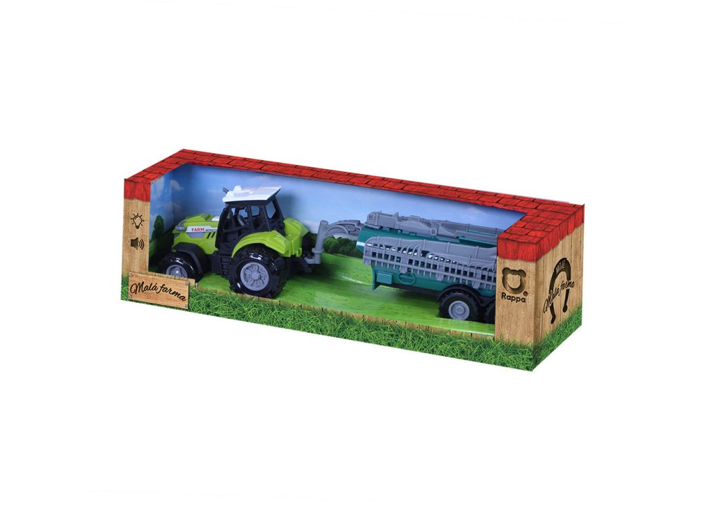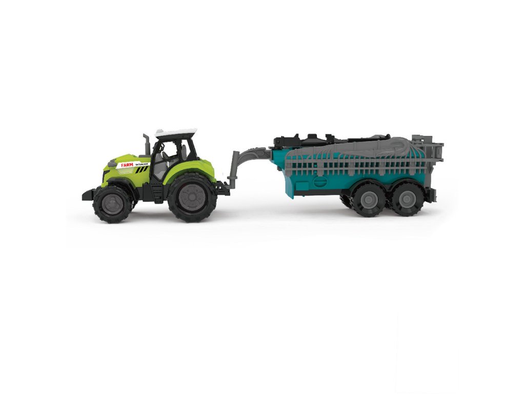 Moderní plastový farmářský traktor s kropící cisternou, hračka z kolekce Moje malá farma. Vlečka se dá jednoduše odpojit a rozevřít. Traktor jezdí na volný chod a jeho délka je 10 cm. Přívěs je v délce 15 cm. Zmáčknutím tlačítka na traktoru vydává reálné zvuky spolu se světelným efektem. Traktor vyžaduje 3 ks baterií typu AG13/LR44, které jsou součástí balení.