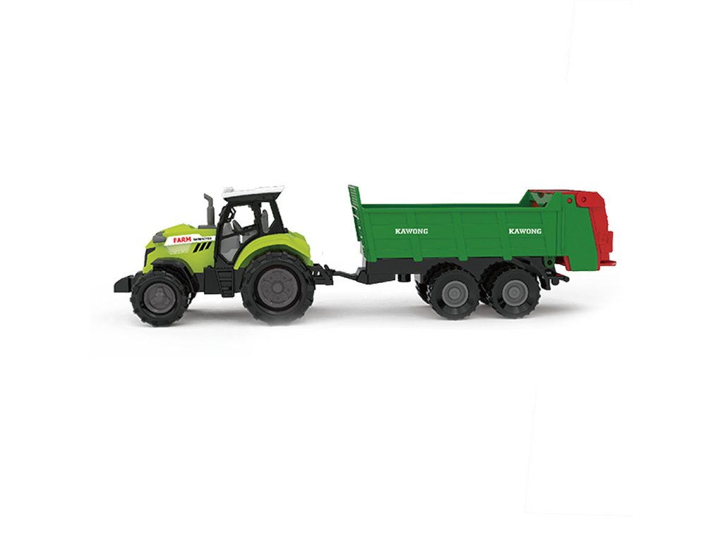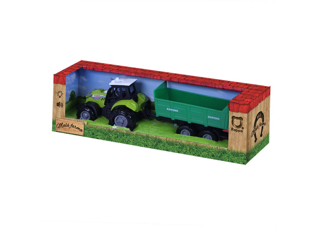 Moderní plastový farmářský traktor s vlečkou, hračka z kolekce Moje malá farma. Vlečka se dá jednoduše odpojit, sklopit a otevřít. Traktor jezdí na volný chod a jeho délka je 10 cm. Přívěs je v délce 12 cm, celková délka včetně přívěsu je 25 cm. Zmáčknutím tlačítka na traktoru vydává reálné zvuky spolu se světelným efektem.