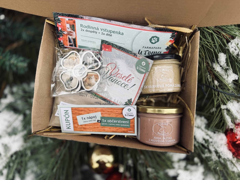 Rodinná vstupenka, krmení pro zvířátka, kupón do bistra, upomínkový předmět, jemná paštika a k tomu škvarková pomazánka – všechno hezky pohromadě v jednom kouzelném dárkovém balíčku.