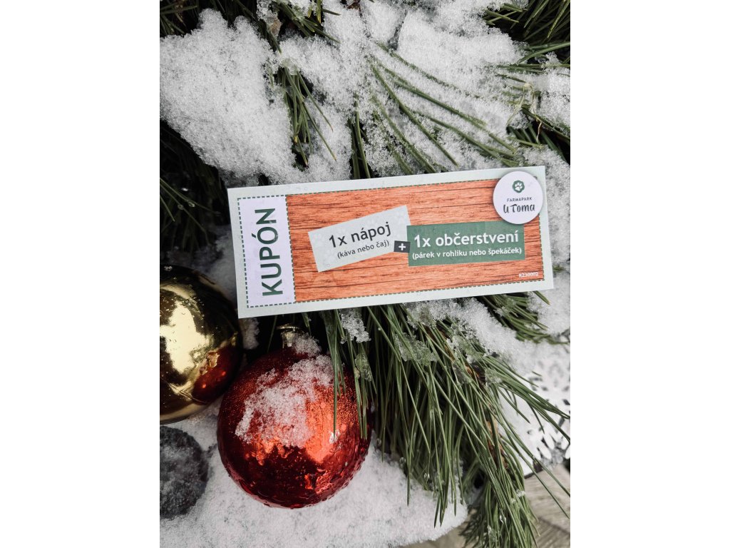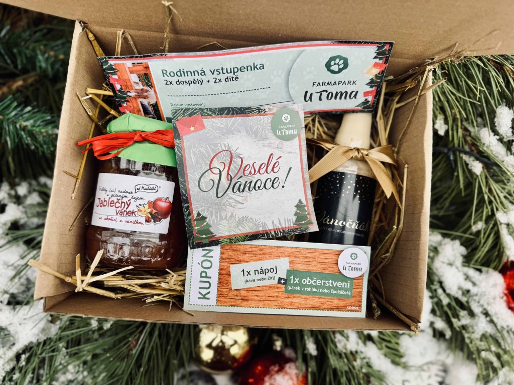 Rodinná vstupenka, kupón do bistra, pečený čaj od Macháčků a k tomu voňavý Vánočňák (vaječný krém) – všechno hezky pohromadě v jednom dárkovém balíčku.